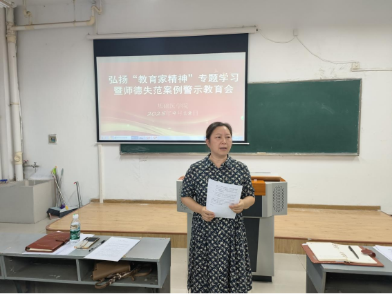 在“教育家精神”专题学习研讨环节,各教研室围绕“我心目中的教育家精神”进行分组讨论,谢敏、许波、刘玲、王龙4名教师代表先后分享心得。谢敏以“全面、底色、第一步、改变、卓越”为关键词,结合身边教师事迹诠释教育初心;许波从“初心坚守、责任担当、耐心坚守、高尚品格”四方面解读教育家精神内涵;刘玲以神经科学为视角,提出教育家精神应兼具“精准对接”“动态平衡”“与时俱进”的特质;王龙则强调,医学院校教师要将“敬佑生命”的医者精神融入教学,让学生读懂医者使命。