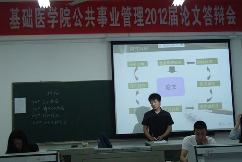 5月12日,我院2012届公共事业管理专业学生在基础楼三楼举行论文答辩,本次论文答辩分五步进行,分别是学生向答辩小组报告自己毕业论文(包括毕业论文的内容、目的和意义、所采用的原始资料、毕业论文的基本内容及主要方法、成果、结论和对自己完成任务的评价),答辩小组老师提出问题(每位学生2-3个问题,包括需要进一步说明的问题、论文所涉及的有关基本理论、知识和技能等),并要求学生对所提问题作正面回答。