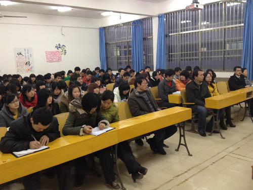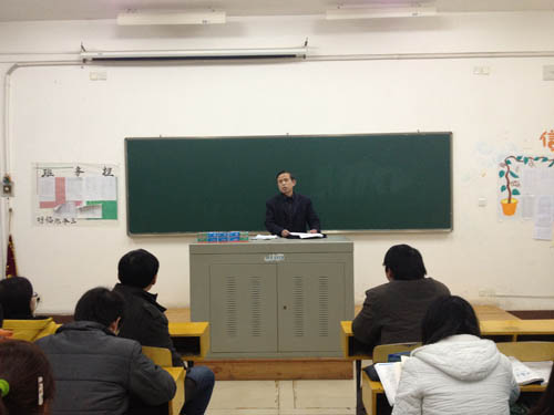 随后,活动小组成员来到7-501,再次观摩了由11级临床本科一班班主任王孝才主持的班会点评。王老师针对班干部反映出的主要问题,结合每位同学上学期的总结,重点强调了大学生心理危机干预的重要性。他希望大家能够互相关爱,共同创造一方健康纯净的心灵净土。在讨论阶段,王老师和大家分享了一篇来自北大校长周其凤与湖南大学学生交流的文字——《关于优秀学生的衡量标准》。他指出,大学里有很多可以利用的资源,除了图书馆和实验室之外,任课教师就是最便捷的资源。大学生只有“培养、锻炼、造就自己”,才能最终收获“做人的态度,想问题的思路,解释问题的方法”。王老师由此延伸到了目标与实践的探讨,分别在事业、学业、人际、文体四个方面提出了独到的培养方法。他说:“每个同学都必须设立清醒的目标,这个目标就是志向。有了目标就不怕路途遥远,而缺乏目标的人就像大海中没有罗盘,无法正确驶向彼岸。”王老师还强调了实践的重要性,没有身体力行,目标都是空中楼阁,纸上谈兵。