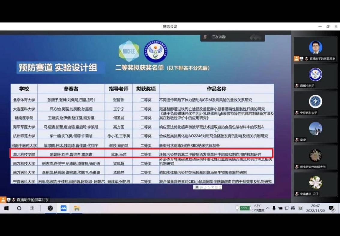 11月18-20日,第八届全国大学生基础医学创新研究暨实验设计论坛中南区复赛在武汉大学举行。本次大赛由高等学校国家级实验教学示范中心联席会基础医学组、高等学校基础医学创新创业协同育人工作组主办,武汉大学承办。采用线上答辩、评审和监督多视频的模式式进行,来自中南赛区7省50余所本科院校的257个赛道项目参赛。williamhill中国7支参赛队伍,按照双盲模式完成了汇报和答辩,获得二等奖1名,三等奖4名,优胜奖2名。由武阳博士和马萍教师指导,2020级临床医学实验班学生喻朝轩、刘卉、鲁维希、雷彦琪组成的参赛队伍,获得的预防医学实验设计论坛二等奖,晋级全国总决赛。