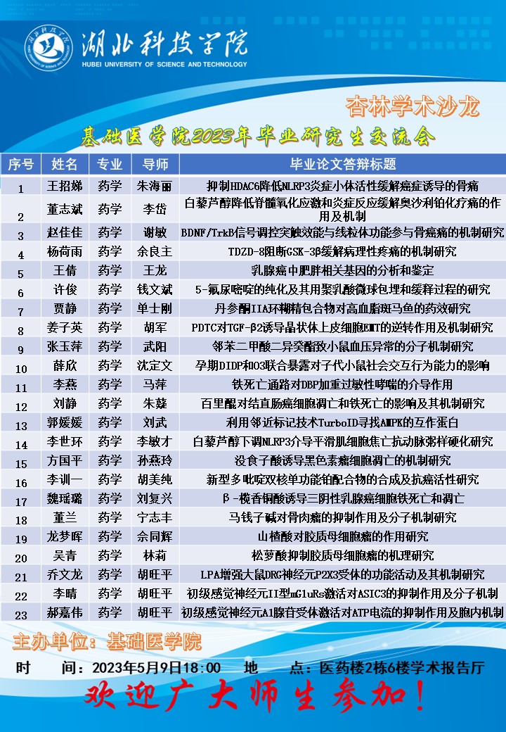 交流会上,23名2023届硕士毕业生依次汇报了各自的学位论文研究课题,并从研究背景、课题设计、研究方法、研究内容、实验结果、成果与展望等方面进行了详细阐述。其中,杨荷雨、王招娣等研究生就不同药物缓解骨癌痛的调控机制做了汇报;薛欣、李燕等研究生围绕环境暴露对啮齿类动物的交互行为以及过敏性哮喘等的影响进行了汇报;李训一、董兰等研究生以肿瘤抑制为主题,汇报了其研究生阶段所作的科研工作。