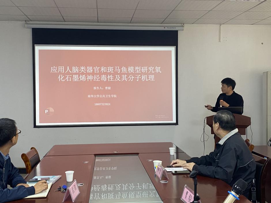 曹毅教授分享了其团队的研究工作,曹教授的讲座分为三部分:1.人脑类器官模型在毒理学中的应用;2.氧化石墨烯在人脑类器官模型的神经毒性反应;3.结合人脑类器官模型和斑马鱼模型研究氧化石墨烯对GABA能神经元及动物行为的影响。讲座结束后,曹教授热情地与师生们展开互动,并对提出的问题给予了详尽的解答。