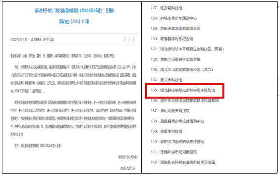 (通讯员:廖文莉,审核:佘同辉)近日,湖北省科协发布了《关于命名“湖北省科普教育基地(2024-2028年度)”的通知》(鄂科协办〔2023〕117号),我校生命科学标本陈列馆成功通过了“湖北省科普教育基地(2024-2028年度)”的复评,并再次正式成为省级科普教育基地。