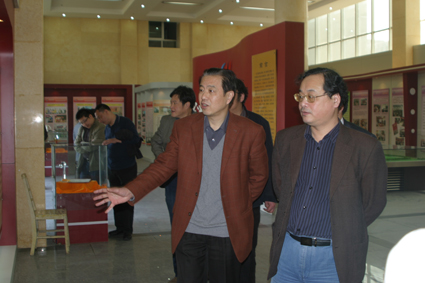 党委书记李友清(左)向检查组介绍办学成就 摄影/若冰