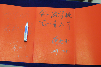 在校党委书记李友清、党委副书记赵学群的陪同下,检查组考察了学校生物标本陈列室。蒋南平在看了标本展览后欣然题词:“创一流学校,育四有人才”。接着,检查组考察了办学成就展厅、学生食堂、田径场以及环揽月湖的文化景观等。考察结束后,检查组在行政楼四楼会议室听取了学校关于文明创建工作的汇报,观看了专题片,查阅了相关资料。校党委书记李友清向检查组做了题为《以争创文明单位为契机,促进学校又好又快发展》的专题汇报,从“三务公开”促发展、“三台明镜 ”话改革和“三个特色”铸品牌三个方面对学校的文明创建工作做了全面汇报。校党委副书记赵学群、吴义煌,副校长钟儒刚、白育庭以及校文明办全体成员出席了汇报会。
