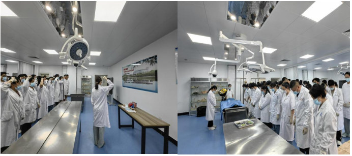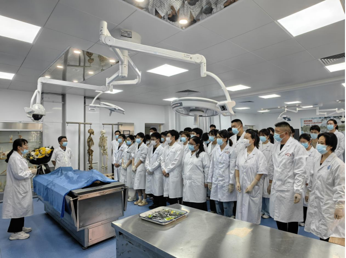 随后,全体师生怀着无比崇敬的心情,向实验室里的 “无言良师”默哀致敬,并依次敬献鲜花。一朵朵鲜花,承载着对逝者的缅怀与感恩。学生代表满含深情地说道:“他们虽无法用言语表达,但却是我们医学道路上最伟大的老师。每一次的解剖操作,都如同一场对生命奥秘的深度探索,更是一份对生命责任的庄重传承。”教研室的教师们也分享了遗体捐献者背后的感人故事,并宣读《解剖学伦理誓言》,全体学生在誓言的感召下,庄重承诺:“定当以科学严谨的态度投入学习,以人文关怀的精神践行医学使命,绝不辜负每一位‘无言良师’的生命之托。”