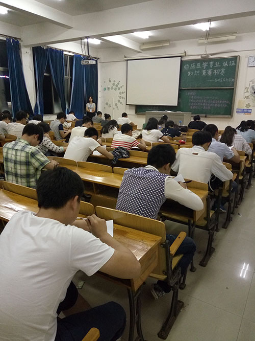 参加本次竞赛的同学来自14,15级临床医学专业,除公管预防班各派5人外,其余班级派10人参赛。当天晚上7:45,胸有成竹的同学们神采奕奕地走进考场,在相应的座位就坐后,由团委学生会学习部干事讲解考试要求,为期一个小时的考试中,允许提前交卷,诚信应考,各考场内有4人监考。微风轻抚耳边,带走初夏的丝丝燥意,伴着片片蝉鸣声,考场里弥漫着紧张而又寂静的气氛。考试正式开始后,每个同学都在奋笔疾书,严谨又认真地答出每一个问题,考场静的只能听见纸张和笔尖呲呲的摩擦声,整场考试中有的同学细心地审视每一个字眼,有的同学正在冥思苦想,眉间轻蹙,有的同学满怀信心对提前交卷。直至晚上9点,考试正式结束。