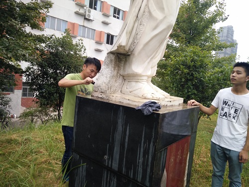沐浴着清晨的阳光,志愿者们拎着水桶、拿着抹布,细心地擦洗着华佗雕像。华佗刻苦钻研医术在中国医学史上留下丰功伟绩,号称“外科圣手”,后人多以神医华佗称呼他。清洗的雕像除了华佗还有很多,比如李时珍、白求恩等。清洗的劳动量大、耗费的时间也多,同学们完成时,都早已满头大汗,但在同学们脸上的不是抱怨、而是笑容,在同学们的心中不是叫苦、而是内心的敬意。