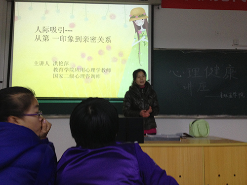 此次讲座邀请了教育学院应用心理学的洪艳萍老师,她从专业角度讲述了人际交往中如何处理宿舍关系等大学生常常遇到的人际交往困惑。期间洪老师讲述的真实事例和生动的叙述,引发了同学们的思考,受到同学们的热情欢迎。