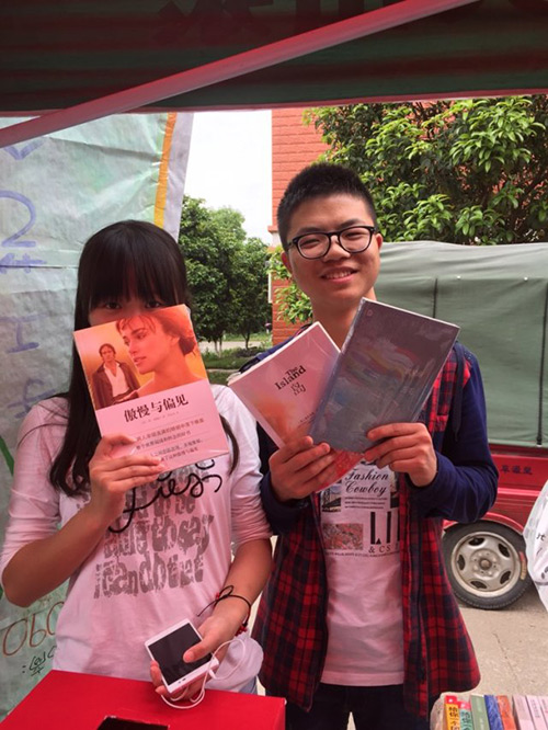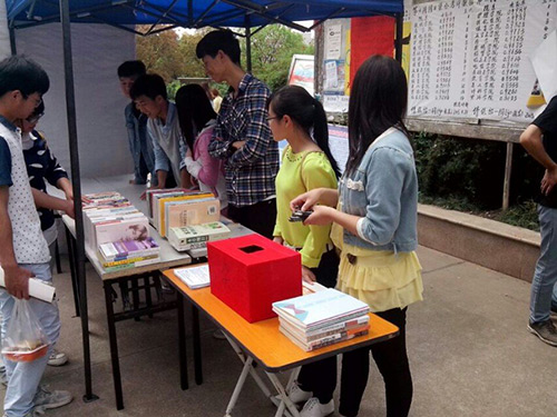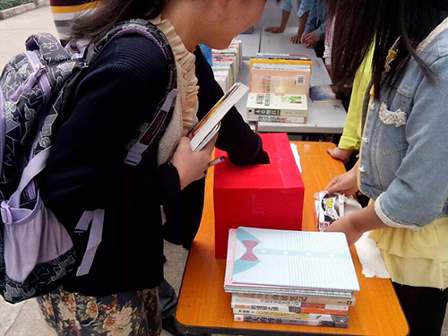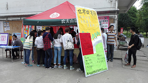 4月23日中午,读书日活动在东、西区宣传栏进行得热火朝天,同学们购书的热情高涨。活动中,购书抽奖,你买我送,旧书分享等环节大大地提高了同学们购书的积极性,很多同学都前来购书,其中也有好多热心的同学将自己的爱书拿出来和大家一起分享。宣传干事们也各有分工,在一阵阵宣传口号中活动井井有条地进行着。同时,为了鼓励同学们多读书,我院还进行了读书奖励这一环节,给我校图书馆借阅量前三名的同学颁发了奖品。