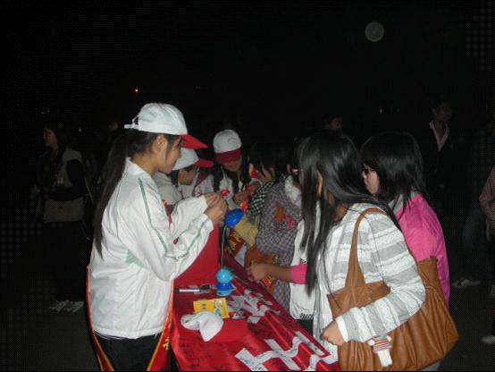 白天,志愿者们在温泉街区以及咸宁学院校内进行积极宣传,发放“预防艾滋病”的小册子。晚上,在学校西区进行募捐义卖活动,红蜡烛围成“红丝带”倍感温馨,露天播放的公益短片感人肺腑,小小的红丝带传递爱的温暖,众人横幅签名活动展示爱的力量。最后,williamhill中国全体志愿者在烛光中进行宣誓,活动在全体合唱“让世界充满爱”中圆满结束。
