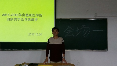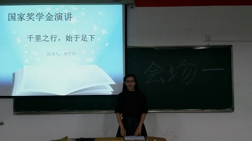 此次评选活动因申请人数较多分为两个会场,在主持人简短介绍了评选活动流程后,由李应续书记致开场词。李书记表达了对每个参评学生的鼓励与支持,并且激励16级新生,要向这些优秀的学长学姐们看齐。两个会场的同学们依次上台演讲,每位竞选者在简单的自我介绍后开始展示他们的大学生活,他们用自己在大学的个人经历告诉新生,如何在大学将自己变成一个优秀的人——要学会自我改变,自我教育,自我学习,提高自学能力,要学会善于利用身边的各种资源,善于思考。有一个良好的生活态度,学习如何正确的待人处事。同时他们也展示出了自己与众不同的一面,例如他们有的人参加过宣传献血公益活动,有的人参加过义务支教活动,也有的人积极参与学校活动和院学生会组织的各种活动。最后,他们都表达了自己对国家奖学金的向往,指出这不仅是一种奖励,更是一种荣誉,并且表示无论得奖与否,他们都会继续努力下去。