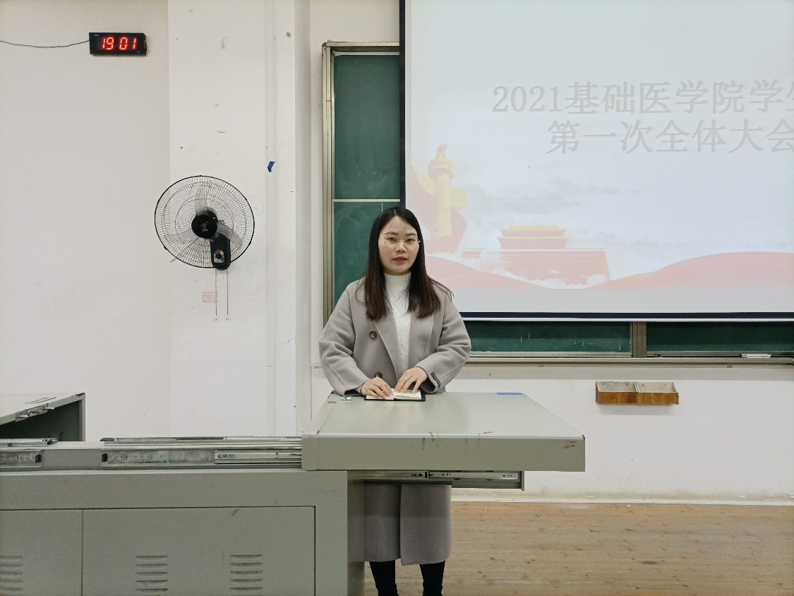 首先,由主持人陈雨萌介绍本次大会内容,并邀请洪莹莹老师上台致辞。洪莹莹老师首先感谢所有学生干部在过去一年里的努力付出,通过分析上学年各项工作的成绩,肯定学生会成员积极完成各项工作的态度,但也指出同学们在工作中的不足之处,希望学生会成员继续发扬优点,并从不足中汲取经验完善自我。最后,洪莹莹老师谈到在新的一年里对同学们的期待,希望同学们在活动策划方面多加创新,积极参与社会实践类活动,不可自满,做好部门活动的同时,也要多服务身边的同学。