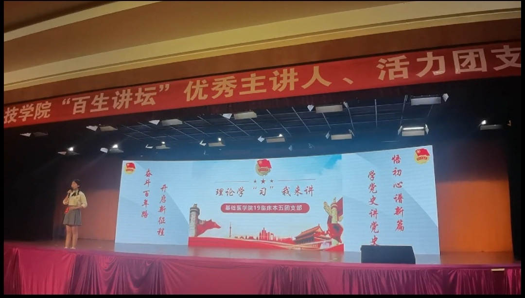 活力团支部比赛设置有两个环节:一是支部学“习”成果介绍;二是支部风采展示。在支部学“习”环节,主讲人李菁琦从支部概况与简介、支部建设与管理、支部风采与成果、支部学“习”与展望四个方面进行了汇报。汇报中提到:19临床本五班即19卓越医师班,特设课程有pbl、大体解剖实验等。支部组织健全,按照共青团三会两制一课要求,学习情况良好。支部成员勤于学习、勇于探索,积极参加医院见习、志愿防疫、科研项目等多种活动,在理论学习之余注重全面发展。支部风采展示部分采用情景剧的形式,以时间为轴,联系2003年与2020年的两次疫情,同学们深受触动,真情实景地演绎出疫情防控期间支部成员参与的各项志愿服务工作,彰显了支部成员作为医学生的责任与担当。在节目的尾声,全体成员集体演唱歌曲《少年·建党版》,深情献礼建党一百周年。