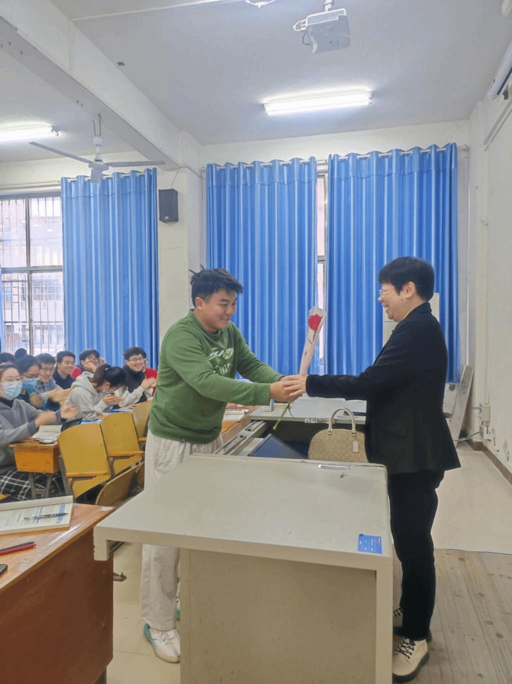 怀着无限敬意,由班委代表向当天授课的女老师献花,并送上亲笔书写的贺,活动氛围浓郁而热烈。课间献花时,授课老师诧异道:“没想到下午也能收到花。”我们笑道,说:“不论什么时候,今天都希望您能收获开心快乐,三八妇女节快乐!希望您能感受到我们的一片心意!”