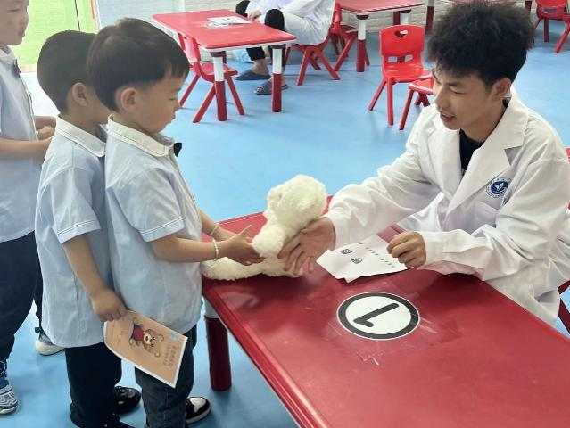 讲解结束后,小朋友在老师的带领下在教室门口排好队,依次带着泰迪熊“看病”。首先,他们在导医台告诉“医生”泰迪熊生了什么病,在“医生”的指引下到相应科室“就诊”。在就诊过程中,相关科室的“医生”会问小朋友们一些问题,帮助小朋友们加深记忆。