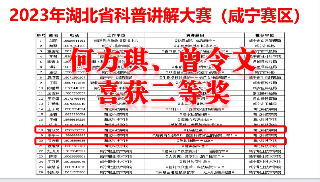 (通讯员:潘丹 廖文莉 ,审核:佘同辉)2023湖北省科普讲解大赛(咸宁赛区预赛)暨William希尔第三届医学科普讲解大赛于10月9日在William希尔举行。williamhill中国生命科学标本陈列馆讲解员团队首次参赛并获得佳绩:2021级williamhill中国学生何方琪、曾令文获得市赛二等奖和校赛三等奖,2022级五官医学院学生刘湘、徐夕喆获得优胜奖。