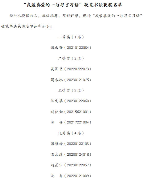 经班级推荐、院级评审,最终选出了10份学生优秀书法作品,其中,张云芳同学获得本次活动的一等奖,吴济臣和周冰冰同学获得二等奖,陈安琪、赵佳如和郝杨同学获得三等奖,张雅婷等四名同学获得优秀奖。