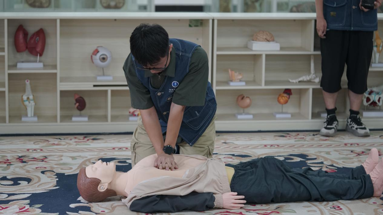 标本馆馆长廖文莉引导盛明科校长一行深入了解了标本馆的发展历程、特色收藏,以及其作为省级科普教育基地和大思政实践基地在人才培养、服务社会等方面承担的重要角色;参观过程中,学生志愿者还进行了海姆立克急救法、CPR心肺复苏急救技能的现场演示,凸显了科普教育在培养实用技能方面的有益作用;此外,VR系统让大家更加直观地认识了生命科学,而学生自主创作的医学可视化作品则展示了跨专业合作的成果、传递了医艺双馨的教育理念。盛校长一行高度赞扬了标本馆的馆建特色及育人成绩。