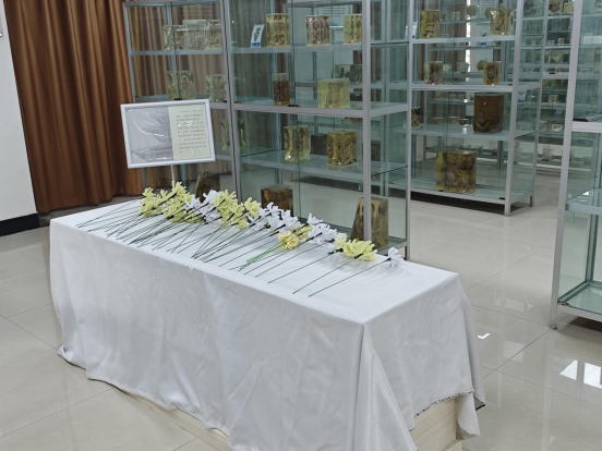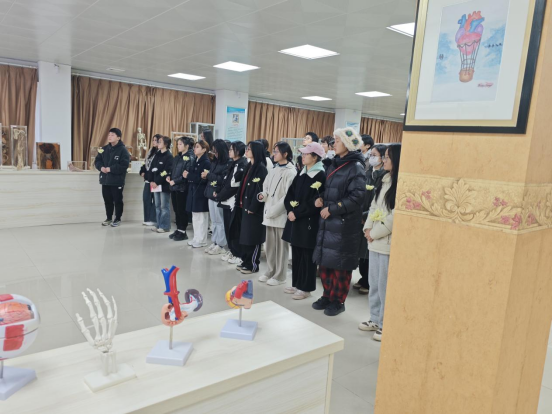师生们在工作人员的引导下,步入了庄严的标本馆。全体人员肃立默哀,表达对生命的敬重和对大体老师无私奉献的感恩;随后,学生们手捧鲜花,步伐整齐而缓慢地走向大体老师所在之处,每一个放下花束的动作都充满了敬意与感激。