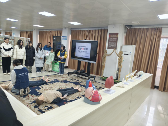 标本馆工作人员现场演示了心肺复苏(CPR)操作,动作规范、神情专注,展示了在黄金四分钟内进行有效急救的步骤,同学们全神贯注地学习记录。这一场景不仅体现了同学们对急救知识的重视,更彰显了他们对生命的敬畏与尊重。