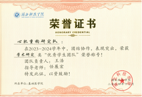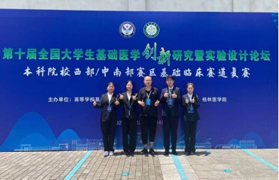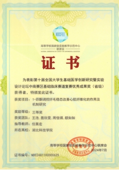 在2024年7月的“第十届全国大学生基础医学创新研究暨实验设计论坛”中南部赛区赛事上,在任展宏副教授指导和带领下,心肌重构研究队成员王浩(队长)、聂欣雯、周佳琪(主讲人)和颜如如同学以“1-茚酮调控纤毛稳态改善心肌纤维化的作用及机制研究”项目斩获省级三等奖。