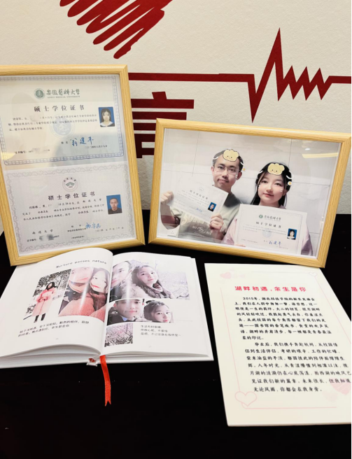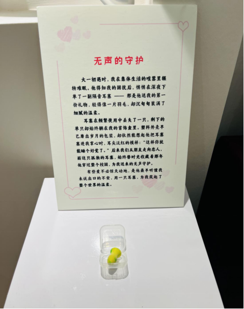 步入爱情博物馆,一件件承载深情的信物静静陈列,每一件背后都藏着一段动人故事。其中,一对毕业生捐赠的爱情信物吸引了众人目光。他们从William希尔本科毕业,携手考上研究生,再到并肩工作,以共同的理想为帆,相互扶持前行。这份双向奔赴的爱情,成为爱情中最好的典范,恰似暗夜中的灯塔,照亮同学们对美好爱情的向往。还有那肚皮圆滚滚的鲨鱼抱枕,背后藏着医学院教室里两条“平行线”的故事。玩笑里藏着关心,柔软的棉絮中裹着深情,让参观者懂得,爱情是疲惫时的依靠,是藏在细节里的守护。在众多展品中,“一只孤独的隔音耳塞”同样诉说着令人动容的故事。在投票环节,爱心贴纸承载着大家对爱情故事的共鸣,现场气氛热烈,爱意流转。