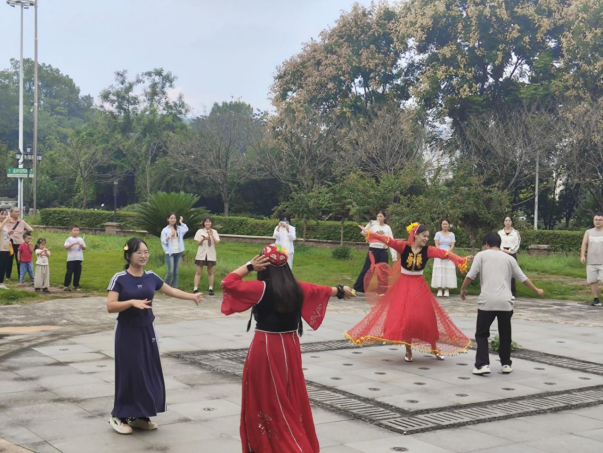 两位维吾尔族姑娘优美的舞姿将气氛推向高潮,她们随着欢快的节奏翩然起舞,眼眸中流转着热情与自信的光彩,在她们热情的邀约下,原本观赏的各族师生纷纷起身,无论熟悉与否,都勇敢地汇入这欢乐的节拍,这心灵的共鸣与情感的共融,生动诠释了“各美其美,美美与共”的深刻内涵,将民族团结的深情厚谊永远定格在各族师生心中。