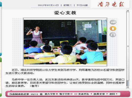 williamhill中国自09年来,携手马桥中学举办的众多活动让一些来自贫困家庭的孩子感受到了社会的关爱。时至今日,同学们依然坚守着这样一份责任,为马桥中学的孩子们带去一点又一点的希望之光。这次支教活动也引起了咸宁媒体的广泛关注。南鄂晚报、咸宁日报、咸宁电视台等媒体都对此次活动做了相关报道。同学们不仅感受到了自己付出的微薄力量,还看到了整个社会对希望的坚守,对爱心的关注。