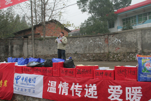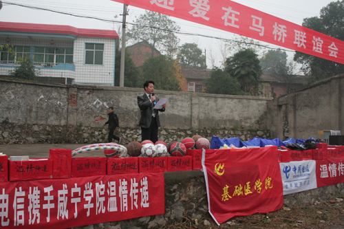 之后,佘院长发表了讲话,向马桥中学全体学生们表达了真切的问候。佘院长说,马桥中学学生们在艰苦的条件下不畏困难,对知识殿堂的追求永远是我们爱心活动的始发点。今天这些事只是咸宁学院学子们力所能及的事,希望能帮到更多的学生。最后佘院长衷心祝愿马桥中学全体学生们能好好学习,健康快乐地成长。