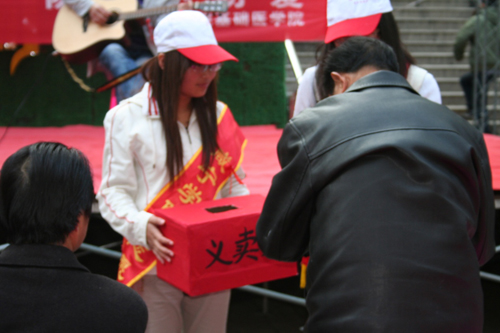 在演出同时,大街上随处可见williamhill中国志愿者忙碌的身影。他们无私奉献在募捐义卖、发放“预防艾滋病”物品的活动当中,尽管寒风凛冽,他们依旧微笑着完成了此次光荣的工作。大学生志愿者们用实际行动播撒真情,传递爱心。最终,本次活动在大合唱《让世界充满爱》中圆满落幕。