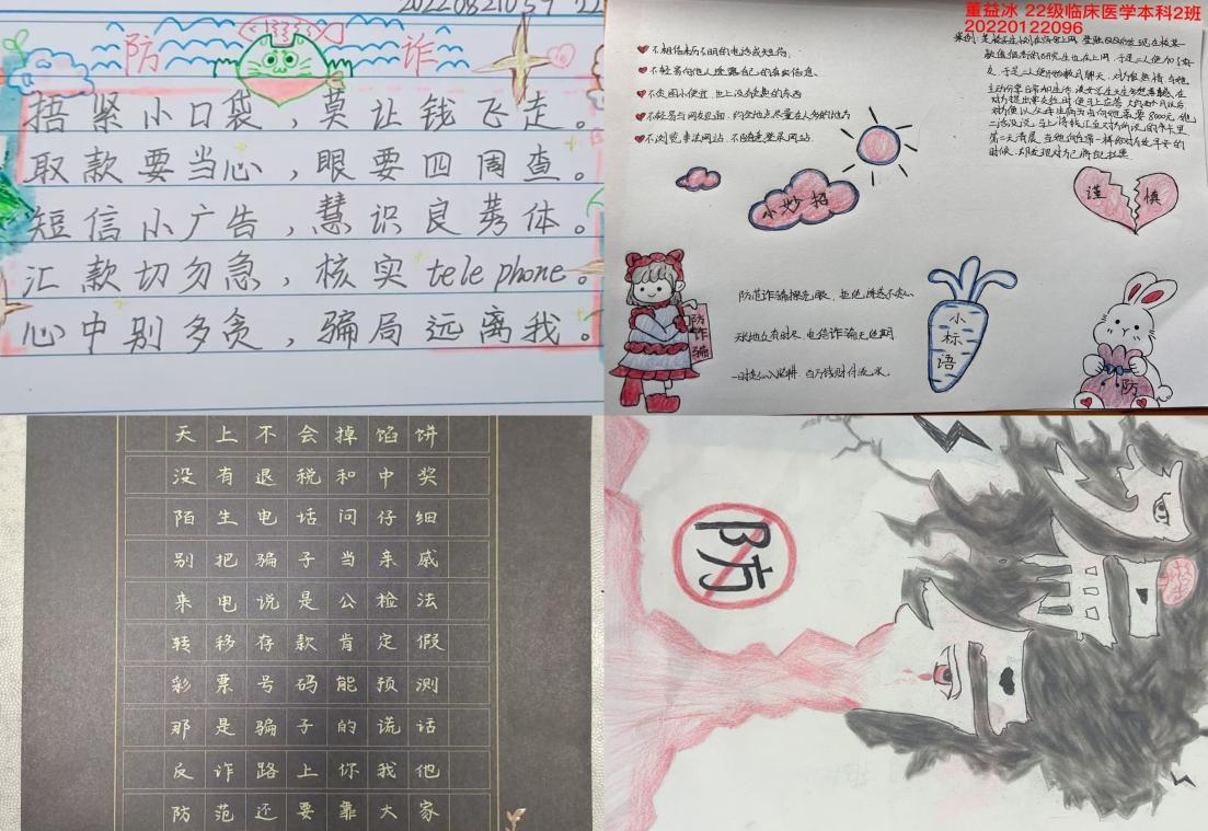 学院组织开展反诈防骗作品征集活动,征集作品包含反诈标语和书画作品。同学们积极参与,作品内容丰富,涵盖多种常见的诈骗手段。通过作品征集的形式提醒广大同学警惕各类诈骗类型,在潜移默化中有效地宣传了校园反诈知识,营造全院共同参与反诈宣传的浓厚氛围。