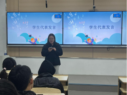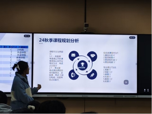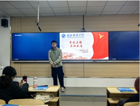 班会中期,各班级优秀学生代表上台分享自己的学习经验。21临床医学(实验)班聂欣雯同学分享了她的期末复习经验:一是确定复习顺序。根据课程的重要性、难易程度以及知识点的关联性来安排复习的优先级。二是预习准备。浏览课程大纲,明确核心要点和考核要求。准备学习工具,如多色笔、笔记本、便签纸,标记重点、记录疑问和总结归纳。三是多次重复学习。医学知识的掌握,重复是关键。第一遍通读教材,全面覆盖内容,建立初步印象。第二遍精读,深入理解知识点内涵、联系及临床应用,搭配做题检验掌握程度。针对错题和模糊知识点,回归教材进行强化复习,然后第三遍快速浏览,巩固记忆,强化知识体系。四是巩固知识点,制作思维导图。总结错题,分析错误原因,包括概念理解、知识点记忆、解题思路等,制作思维导图,整合章节知识点,以人体系统为中心,串联分散知识点,形成有机整体。宏观把握知识架构,提高复习效率。22临床医学1班李爽同学则分享了英语学习的方法,备考英语四六级是一个系统工程,需要持之以恒的努力和科学的方法。通过加强英语单词学习,明确并改善弱项,同时保持并发展强项,能够更有效地提升英语水平,为考试做好充分准备。