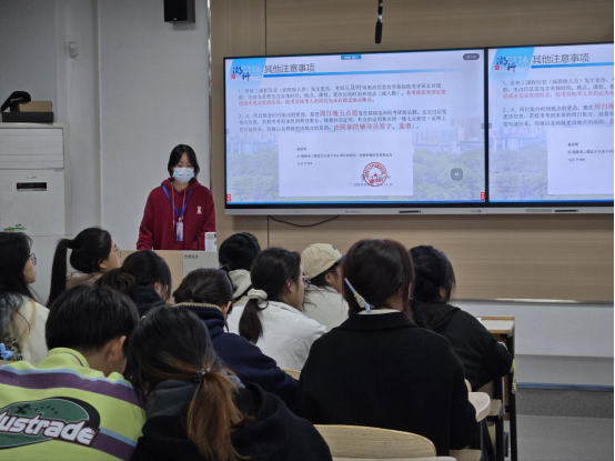 同步开展的班干部业务培训围绕“服务赛事推进与班级管理”展开,学习考评部副部长袁诗燕以“班级管理与活动协同”为主题,结合考勤统计、活动衔接等实例,帮助班干部提升工作效率,为后续组织班级初赛、收集参赛材料提供实操指导;副部长柳金霞则聚焦“信息传达与反馈机制”,强调班干部需精准传递赛事通知、及时收集同学疑问,搭建“老师——学生”双向沟通渠道。