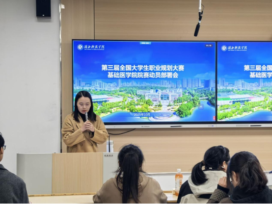 大会核心环节聚焦职业规划大赛专题动员,洪莹莹以《第三届全国大学生职业规划大赛williamhill中国院赛方案》为核心,从“大赛简介、赛制规则、赛程安排、奖项设置、工作要求”五大维度展开解读。她不仅介绍了赛事定位与核心目标,更详细拆解了从班级选拔到院赛评审的具体流程、参赛材料规范及时间节点;同时明确“精心组织、充分动员、密切联系”的工作准则,为后续各班级班赛组织开展提供清晰指引。针对班干部角色,她特别强调:作为连接学院与同学的关键桥梁,既要主动将赛事信息精准传递到班级每一位同学,确保无遗漏、无偏差;更要积极挖掘班级内有想法、有潜力的同学,鼓励大家借赛事契机系统梳理职业目标,结合医学专业特色规划发展路径,为未来医学职业道路夯实基础。