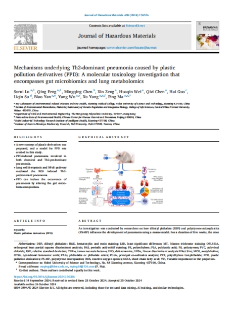 (通讯员马萍审稿蔡飞)近日,中科院一区Top期刊《Journal of Hazardous Materials》(IF=13.7)在线发表了题为《Mechanisms underlying Th2-dominant pneumonia caused by plastic pollution derivatives (PPD): A molecular toxicology investigation that encompasses gut microbiomics and lung metabolomics》的文章。该研究由我校williamhill中国环境疾病与全健康校级重点实验室马萍教授团队主导完成,William希尔为第一署名单位,鲁素蕊博士为第一作者,马萍教授为通讯作者。