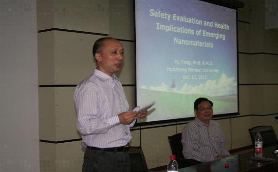 本次学术报告,我院有幸邀请到了华中师范大学博士生导师杨旭教授担任报告人。报告一开始,所有同学鼓起了的热情的掌声。随后,杨旭教授用英文和插图为同学们详细地介绍了本次学术报告的内容,生动形象地诠释了纳米材料在当今社会的广泛应用意义。杨旭教授语言由浅入深,深度剖析出纳米材料在现代医学、公共卫生事业管理、检验药用载体等方面的广阔前景和实用价值。最后,杨旭教授还向同学们展示了其实验成果和实验经验。