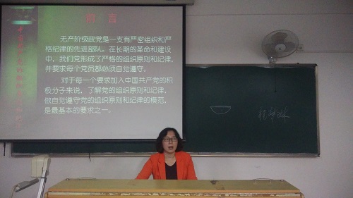 2017年5月8日晚上,williamhill中国分党校入党积极分子在解剖楼教室参加“中国共产党的组织原则与纪律”培训课,此次培训邀请到williamhill中国党总支书记程梦琳老师 。学员们通过学习党的组织原则与纪律,了解到党的组织原则与纪律, 能够“以身作则,严于律己,讲诚信、懂规矩、守纪律,襟怀坦白、言行一致,心存敬畏、手握戒尺”,使学员们从思想上对党的认知改变,从而对党忠诚老实,对群众忠诚老实,有利于发扬党的组织与纪律性,继承党的先进性与光荣性,为实现伟大的中国梦奋斗,争取做合格的建设者和可靠的接班人。