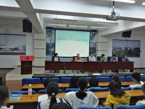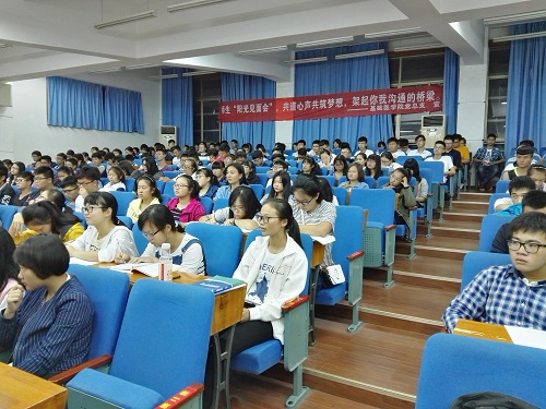 师生阳光见面会在一种热烈、友好的气氛下进行。教师们倾情教导,如航灯般指亮了同学们迷惘的双眼,如春雨般滋润了同学们稚嫩的心田。本次师生阳光见面会,加强了新生对专业和学院的了解,使同学们明确了自己的方向,在师生之间架起了一座沟通桥梁。