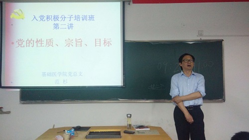 5月4日晚上,williamhill中国分党校入党积极分子在解剖楼教室参加“中国共产党的性质、宗旨和目标”培训课,此次培训邀请到五官医学院党总支书记范杉担任主讲。