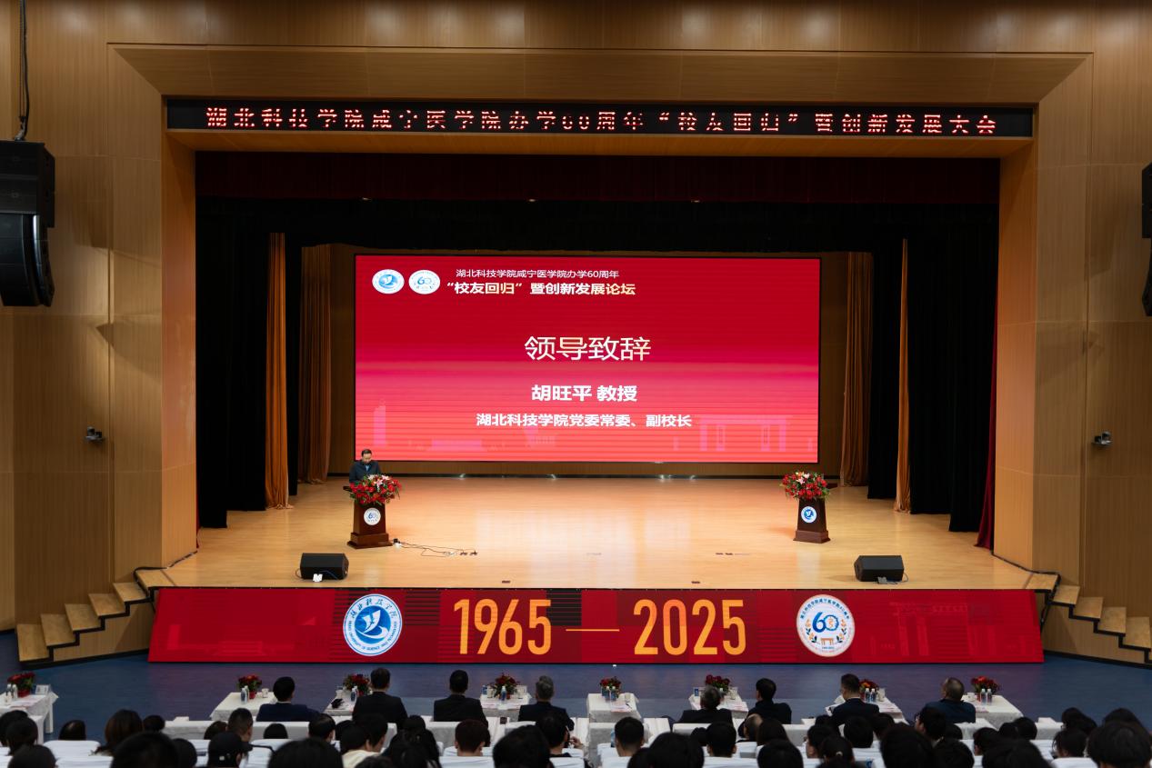 开幕式致辞,胡旺平副校长代表学校对各位嘉宾与校友的回归表示热烈欢迎,回顾了咸宁医学院六十年来在人才培养、科学研究、社会服务等领域的贡献,向长期以来关心支持学校发展的各界人士与广大校友致以诚挚感谢,并展望了学校在新时代医学教育改革浪潮中的发展蓝图,激励全体师生与校友携手共进,续写医学教育新辉煌。